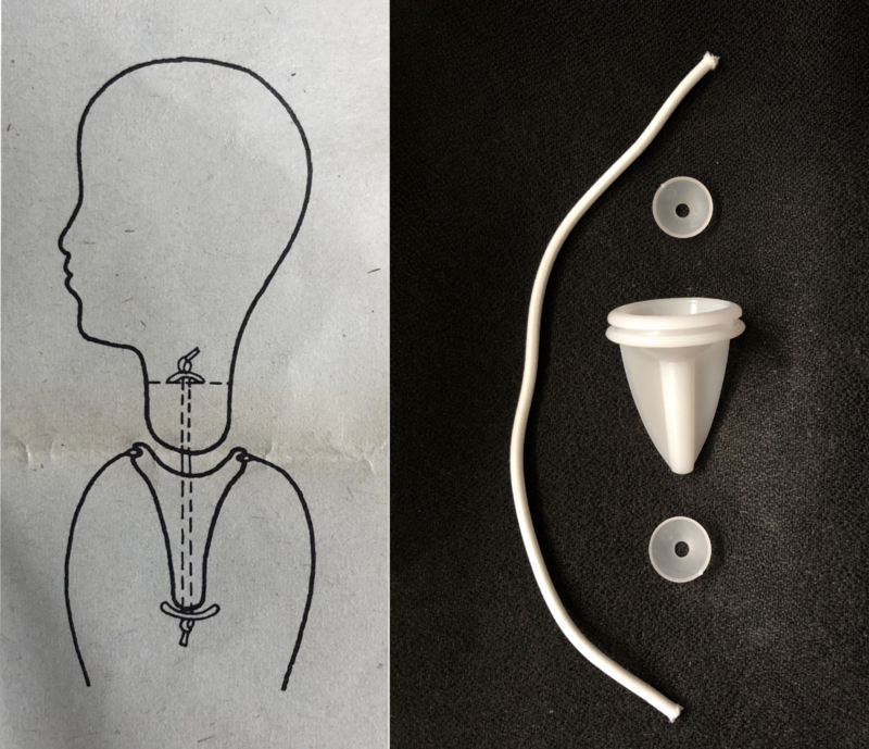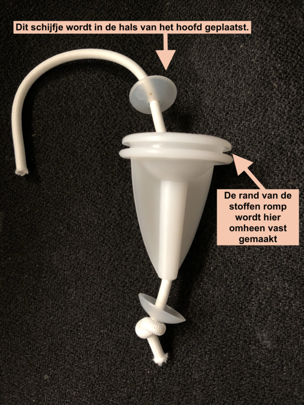 OverzichtDit is een verbinder waarmee je een hoofd op een poppenlijf van stof / textiel kunt vastmaken, waarbij het hoofd óók nog draaibaar is. Op de foto's is te zien hoe dit werkt. Het elastiek dat erbij geleverd wordt, moet op spanning worden gebracht voor een stevige verbinding. Hierbij kan een klemschaar handig zijn, welke te koop is in de webshop.