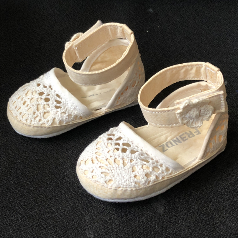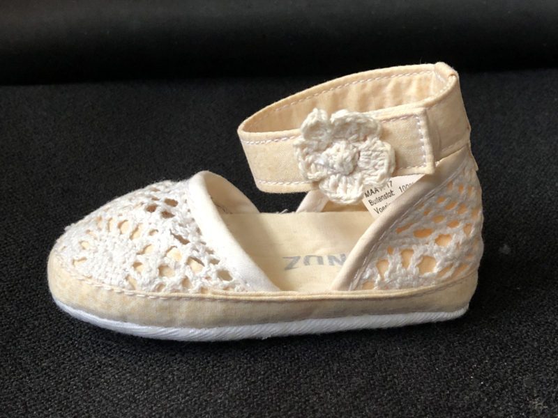 Katoenen poppenschoentjes roomkleur 10,5 x 5 cm.