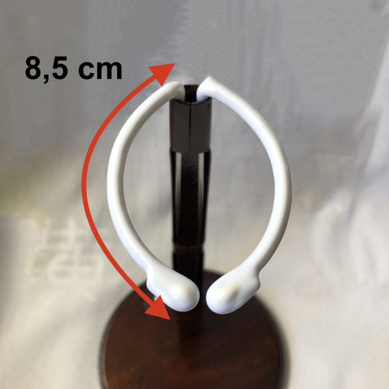 lengte van beide pootjes van de circelvormige klem met de bocht meegemeten: 8 cm per pootje ( zie de derde afbeelding). Meet svp de taille van uw pop en vergelijk die maat met de maat de klem vòòrdat u een aankoop doet !