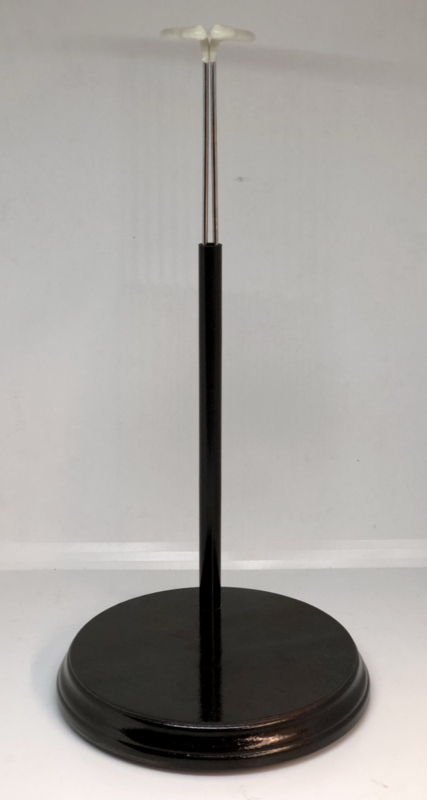 Vintage poppenstandaard rond hout voor een tot 30 tot 40 cm lange pop .