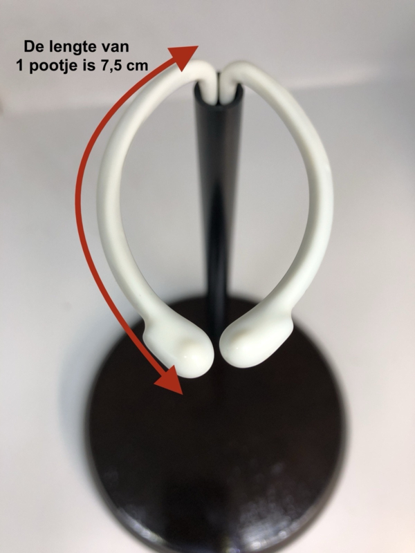 lengte van beide pootjes van de circelvormige klem met de bocht meegemeten: 7,5 cm per pootje ( zie de derde afbeelding). Meet svp de taille van uw pop en vergelijk die maat met de maat de klem vòòrdat u een aankoop doet !